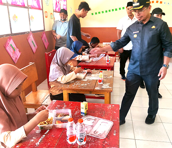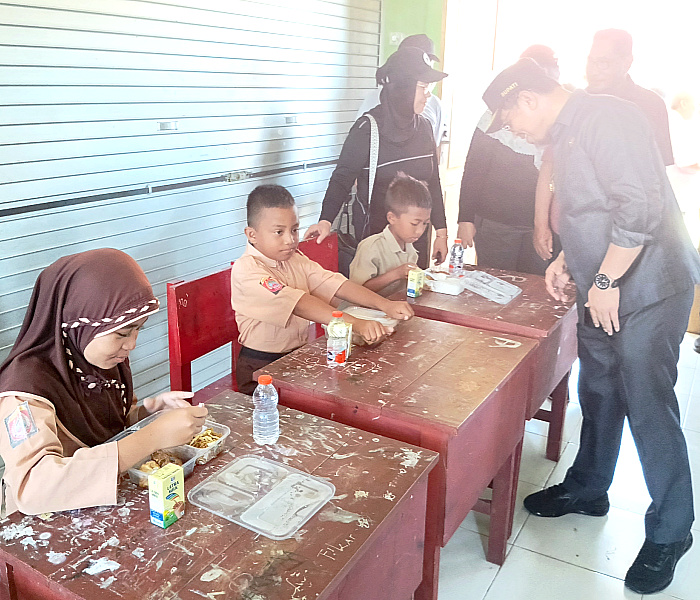 Bupati Boltara Sirajudin Lasena, didampingi Wabup Boltara Mohammad Aditya Pontoh, meninjau langsung uji coba pelaksanaan program MBG di SD Negeri 10 Sangkub Desa Busisingo Kecamatan Sangkub, Jum'at (20/06/2025)