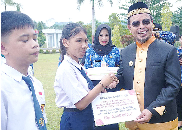 Bolmut – Bupati Bolaang Mongondow Utara (Bolmut) Dr. Sirajudin Lasena, SE, ME.Dev, membacakan sambutan tertulis Gubernur Yulius Selvanus, SE, saat menjadi Inspektur Upacara (Irup) pada peringatan Hari Ulang Tahun (HUT) ke-60 Provinsi Sulawesi Utara (Sulut) yang digelar di halaman kantor Bupati Bolmut, Selasa (23/09/2025).