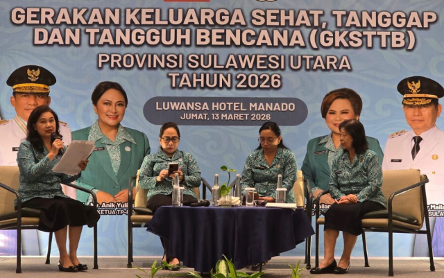 MANADO–Tim Penggerak Pemberdayaan dan Kesejahteraan Keluarga (TP-PKK) Provinsi Sulawesi Utara menggelar Workshop Gerakan Keluarga Sehat Tanggap dan Tangguh Bencana (GKSTTB) di Luwansa Hotel & Convention Center Manado, Jumat (13/3/2026).